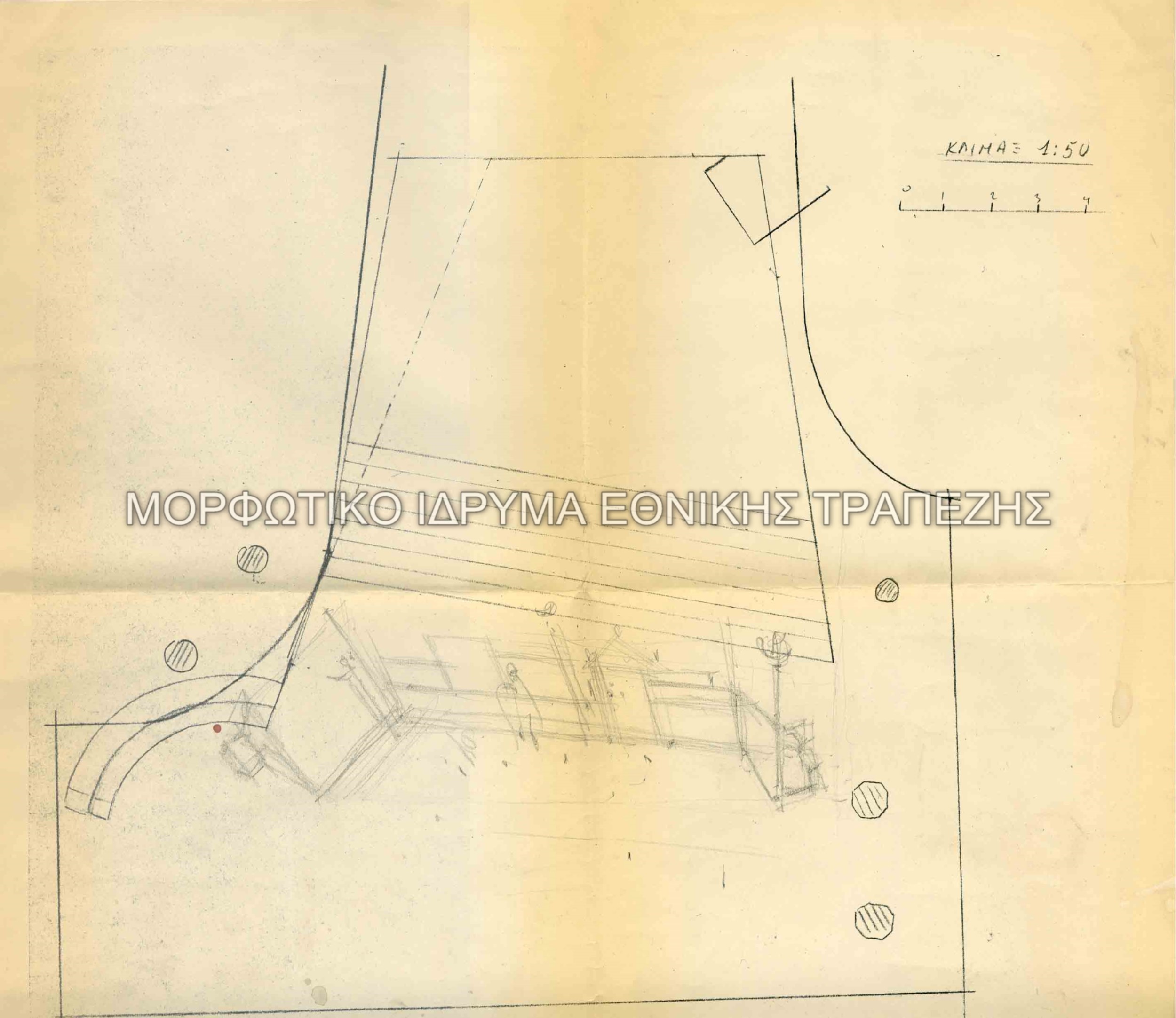 Κάτοψη σκηνής (αρχιτεκτονκό σχέδιο) με σκαρίφημα για σκηνικά, Πλούτος του Αριστοφάνη, Θέατρο Τέχνης Κάρολος Κουν